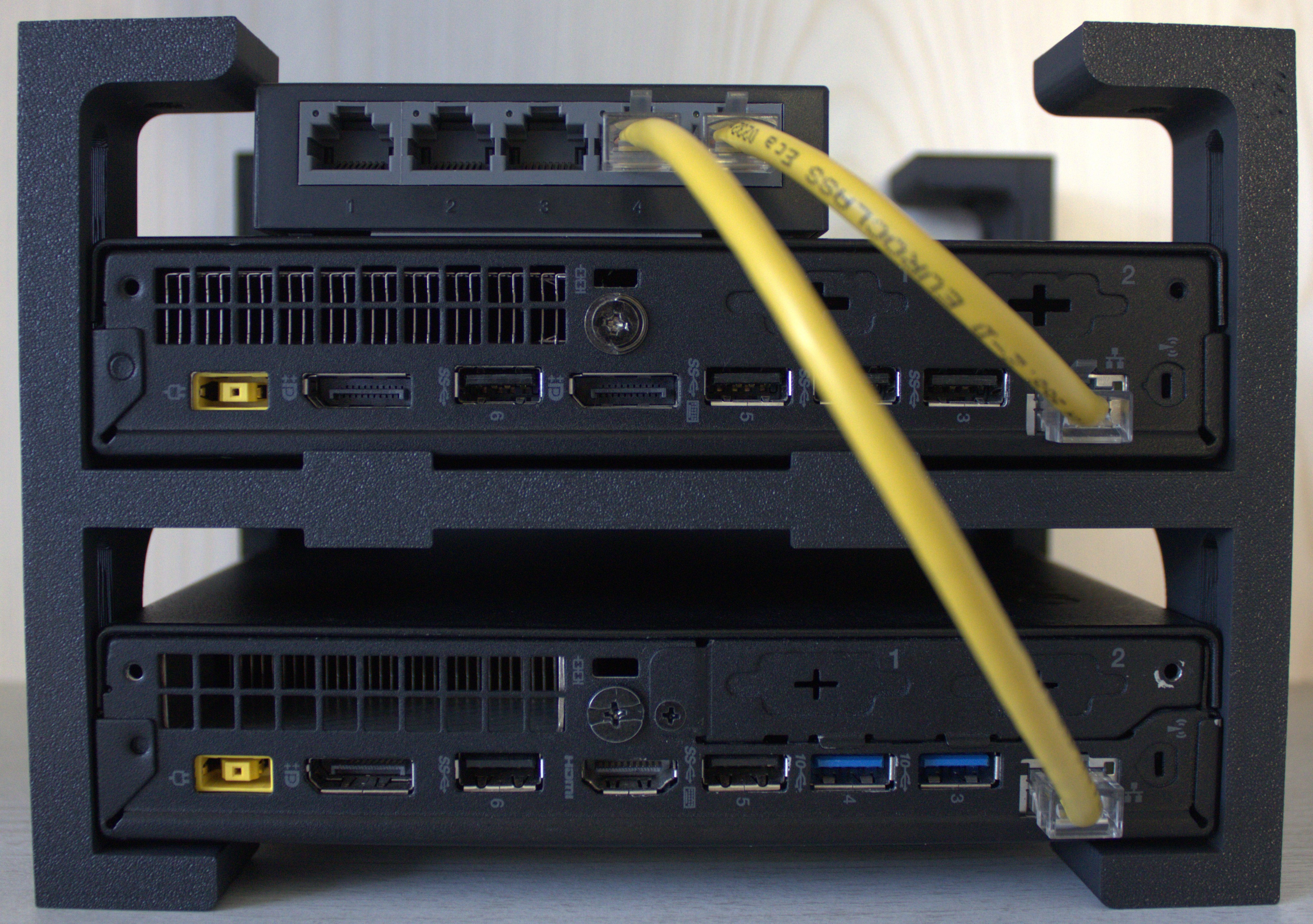 - Główny serwer to Lenovo ThinkCentre M720q Tiny, wyposażony w procesor i5-8500T, 32 GB RAM oraz dyski 500 GB NVMe i 1 TB SATA SSD. Wybrałem go ze względu na niski pobór mocy (~12,5W w idle) przy stosunkowo wysokiej wydajności, co pozwala na ciągłą pracę bez znacznych kosztów energii.